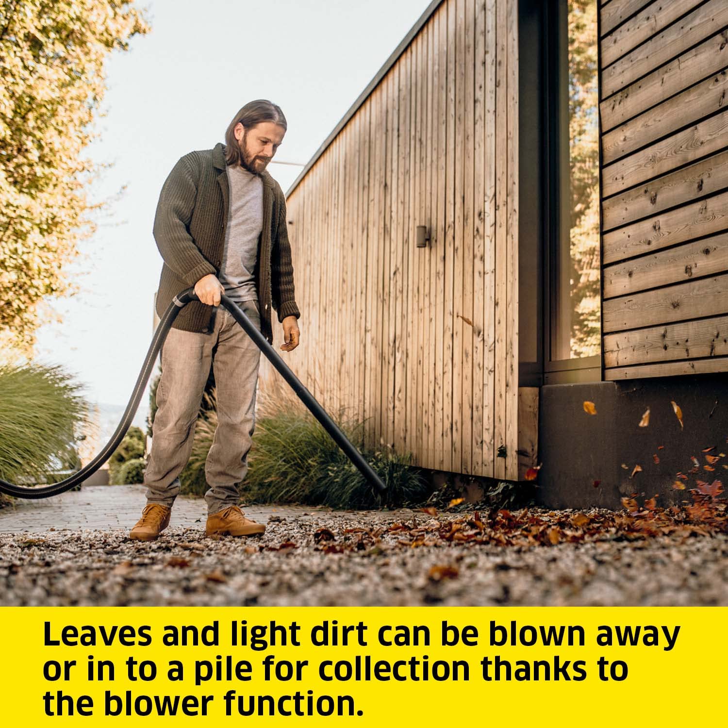 Powerful performance: The wet and dry vacuum cleaner has 240AW suction output. It vacuums up dust and dirt completely and has a blower function to blow leaves or shavings off surfaces