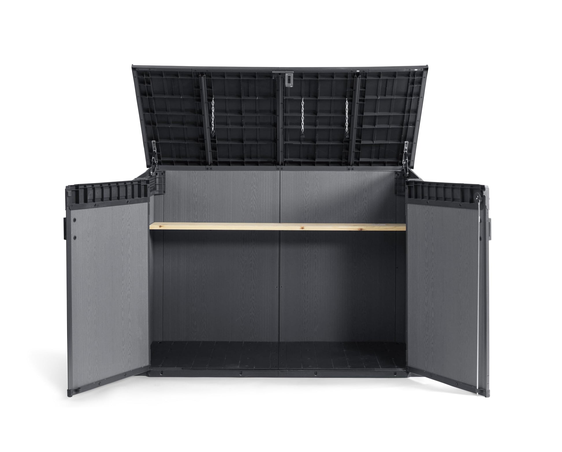 This outdoor chest with a very attractive design has a large storage capacity of 2,020 litres. Its polypropylene material, treated against UV, gives it a wood look according to Evotech technology. This box is very durable and rigid thanks to a reinforced metal frame. A ventilation grille ensures air renewal and limits the phenomenon of condensation. Practical, it will not require any maintenance. The doors are lockable to secure your tools and accessories (padlock not included). This box is resistant to cold, heat and all weather conditions. It can be painted for added customisation. Its roof supports up to 150 kg/m². The included floor protects your items from moisture and mud. Its angled access threshold will make it easier to store items with wheels. This shed comes with chains to hold and raise the bin lids. Size: 190.5 x 109.3 x 132.5 cm (L x W x H).