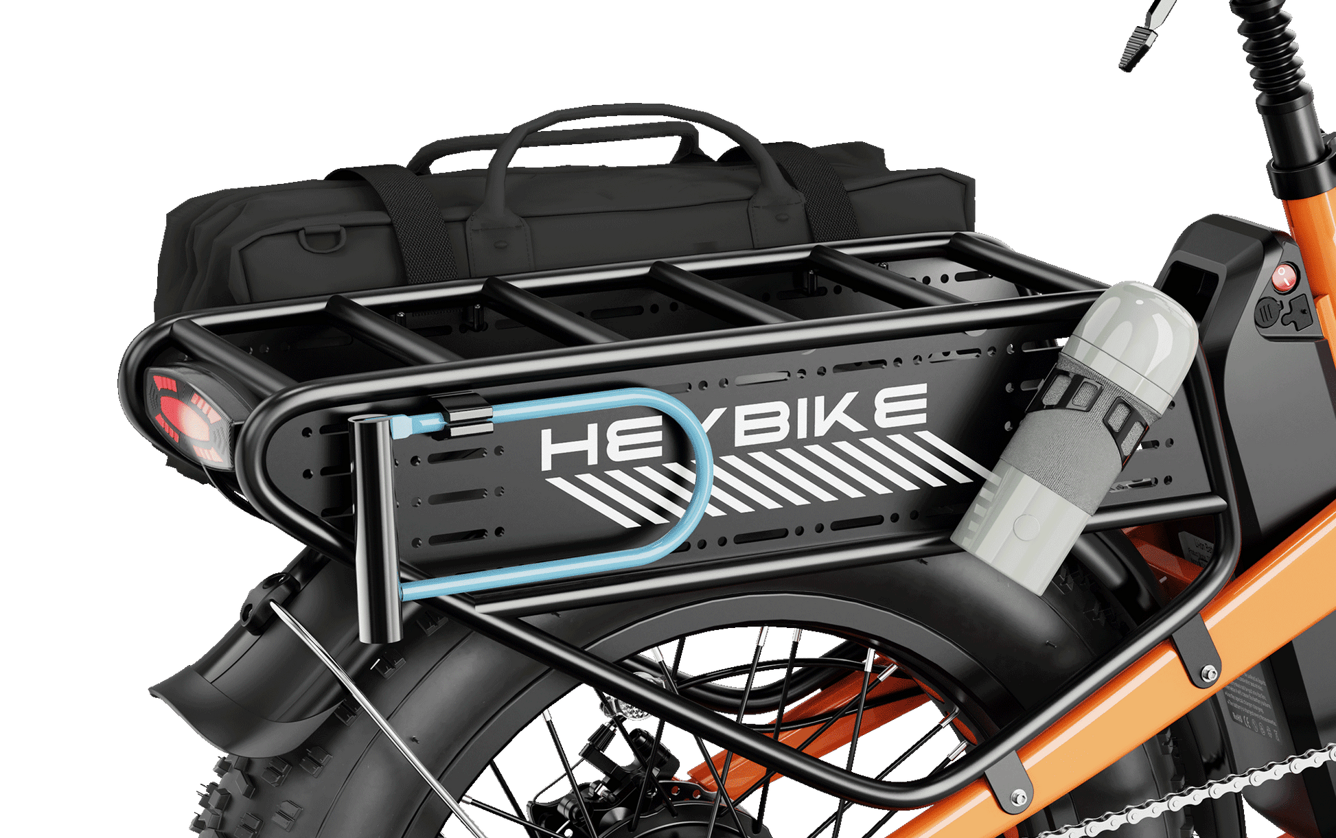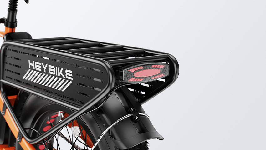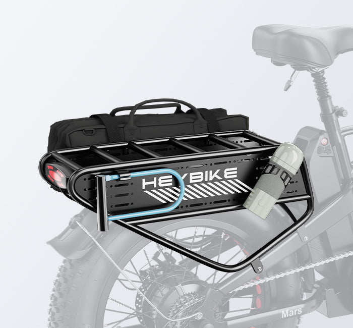 The rear rack can load up to 120 lbs. With pedboards on both sides, you can easily attach various things like water bottle, bike lock and so on.