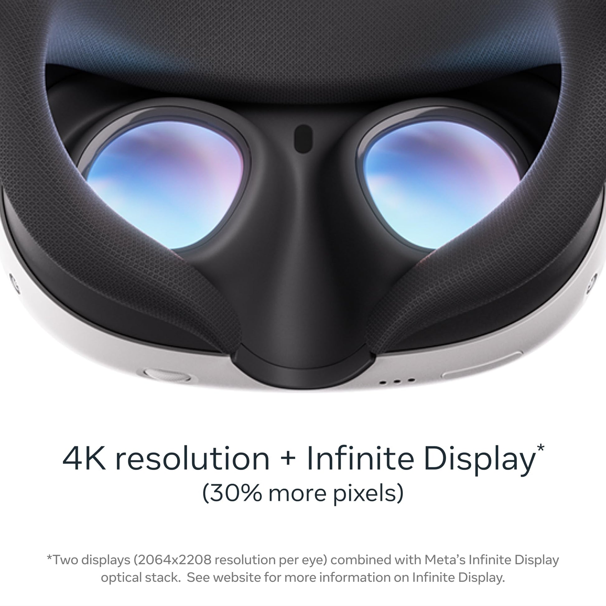This is the ultimate mixed reality device, with Infinite Display for the widest and most expansive field of view of any Quest, 4K resolution,* premium comfort and the most storage. *Two displays (2064x2208 resolution per eye) combined with Meta’s Infinite Display optical stack.