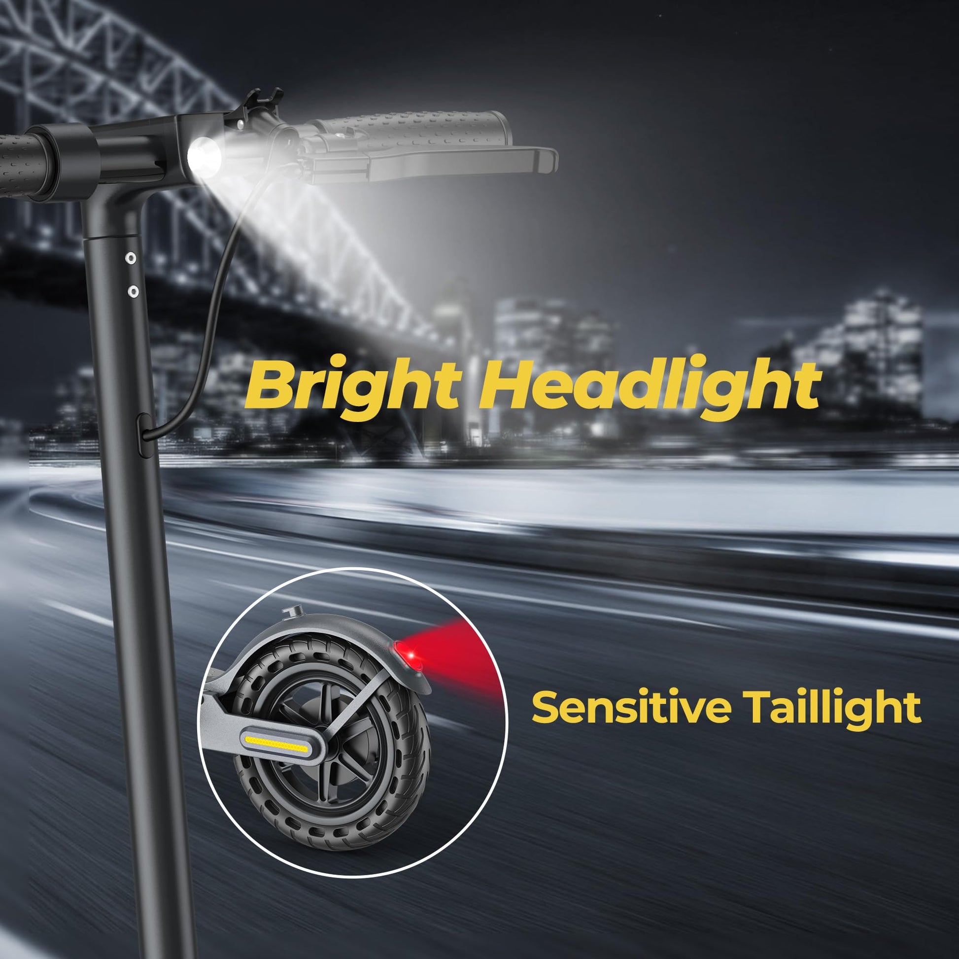 Double Braking, Double Lighting: R50 Electric scooter have dual braking system that combines an electric braking system and drum brakes, which work together to provide maximum safety. Bright headlight and rear brake light ensure visibility of the electric scooter at night.