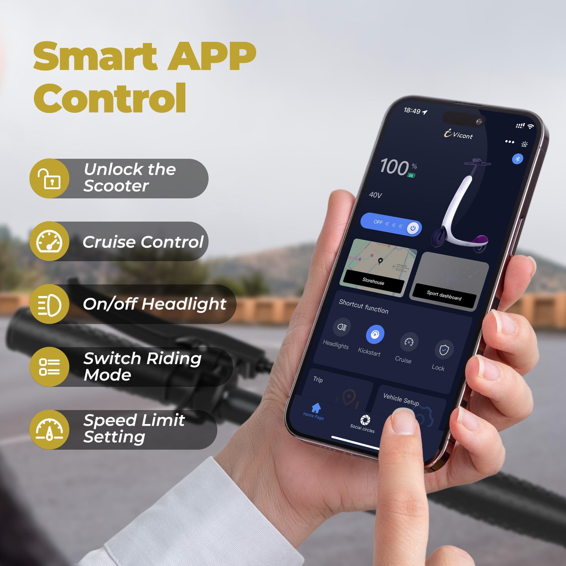 APP Control, LED Display: Use APP to control your electric scooter, it provides more personal function Settings, such as lock/unlock, light on/off, gears, start mode, customize set top speed, cruise control, etc. Smart LED display allows you to easily understand the current status of the electric scooter, simple and clear.
